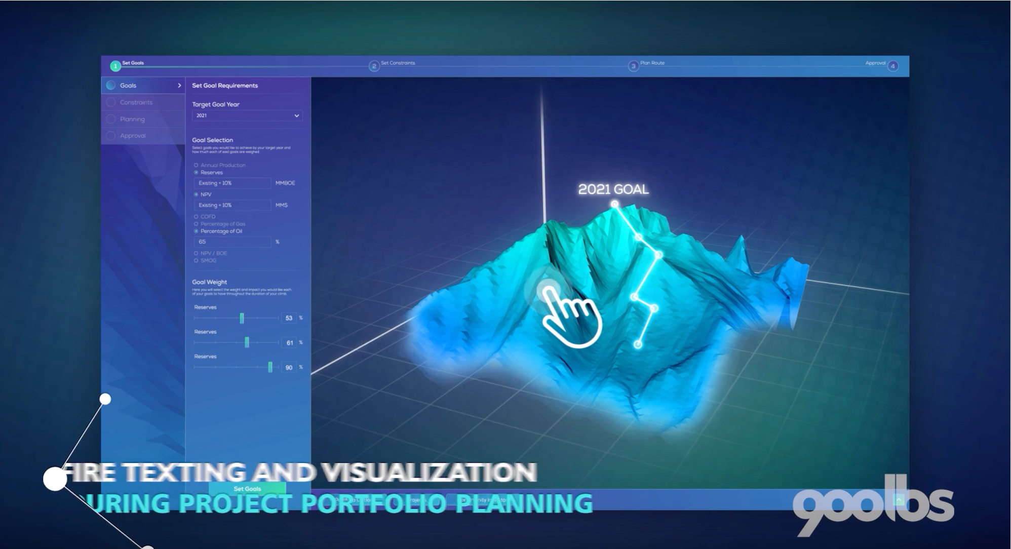Three key design innovations streamline the intense workflow of capital planning teams: [1] A dynamic augmented reality mountain that conveys a summit as the corporation’s goal one, two, even five years in the future, while the mountain’s local terrain steepness, contours, and color mapping use AR to illustrate portfolio risk. [2] Our modern front-end design enables distributed computing and cloud-based data analytics to calculate if-then scenarios in real time, such as the effects of oil price shocks on a portfolio’s Net Present Value, projects’ contribution to corporate portfolio goals, and flexible alternatives. [3] Our iPad companion app allows simple and collaborative data visualization in an open-office or boardroom setting.
