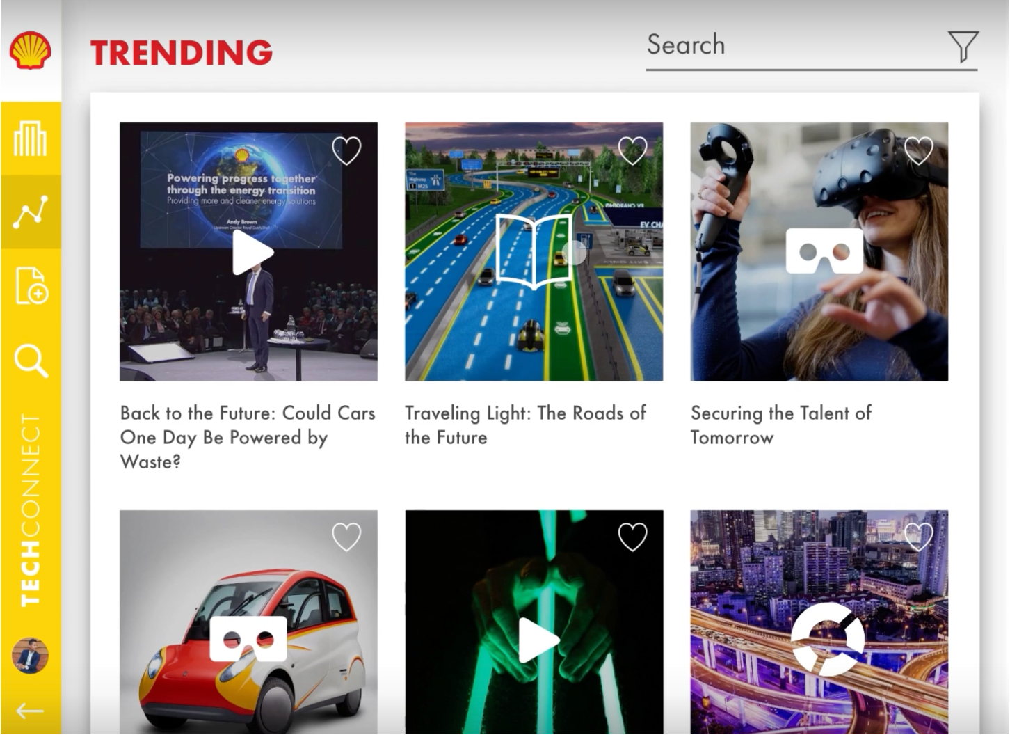 TechConnect is a digital ecosystem that allows users to engage textual, media, interactive, immersive, stylized, and visual content to drive the user experience. With the comprehensive design model, which includes our design chemistry sessions, mix-methods data capture tools, and our iterative design process, TechConnect is evolving into a practical and dynamic tool that Shell will be able to utilize throughout the value chain. The program utilized our proprietary scientific design method and process to dream up a new way to visualize robustly curated content.